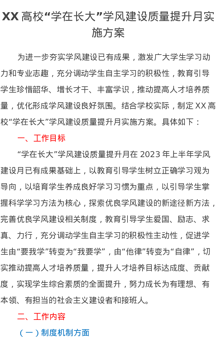 XX高校“学在长大”学风建设质量提升月实施方案