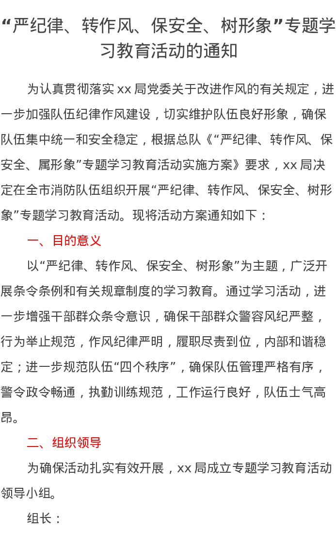 “严纪律、转作风、保安全、树形象”专题学习教育活动的通知