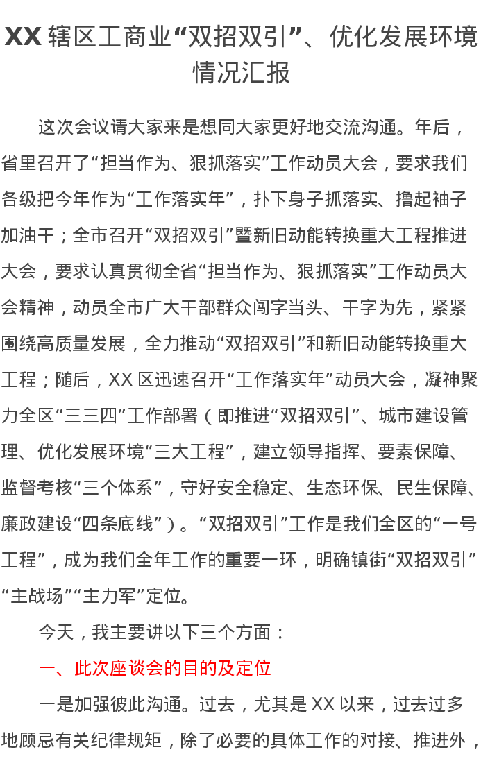 XX辖区工商业“双招双引”、优化发展环境情况汇报
