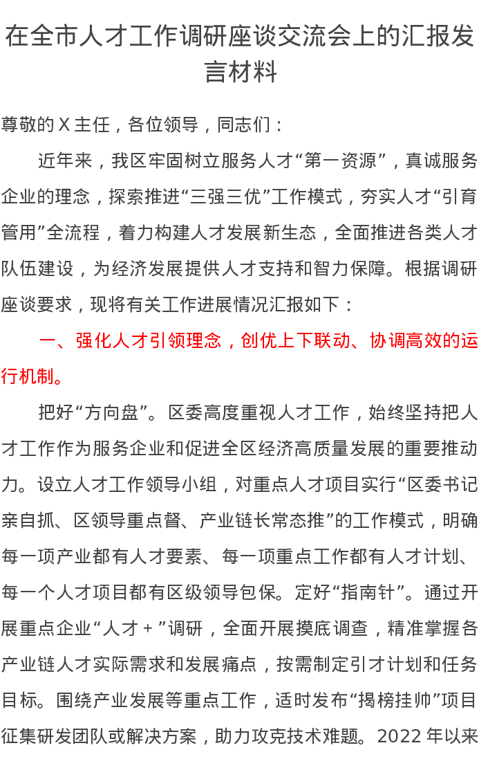 在全市人才工作调研座谈交流会上的汇报发言材料