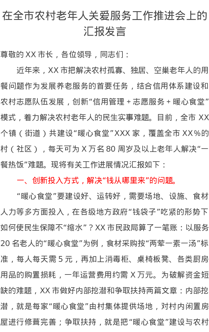 在全市农村老年人关爱服务工作推进会上的汇报发言