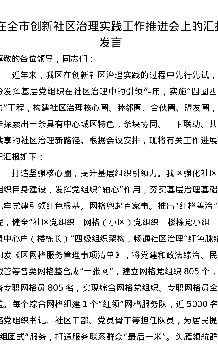 在全市创新社区治理实践工作推进会上的汇报发言