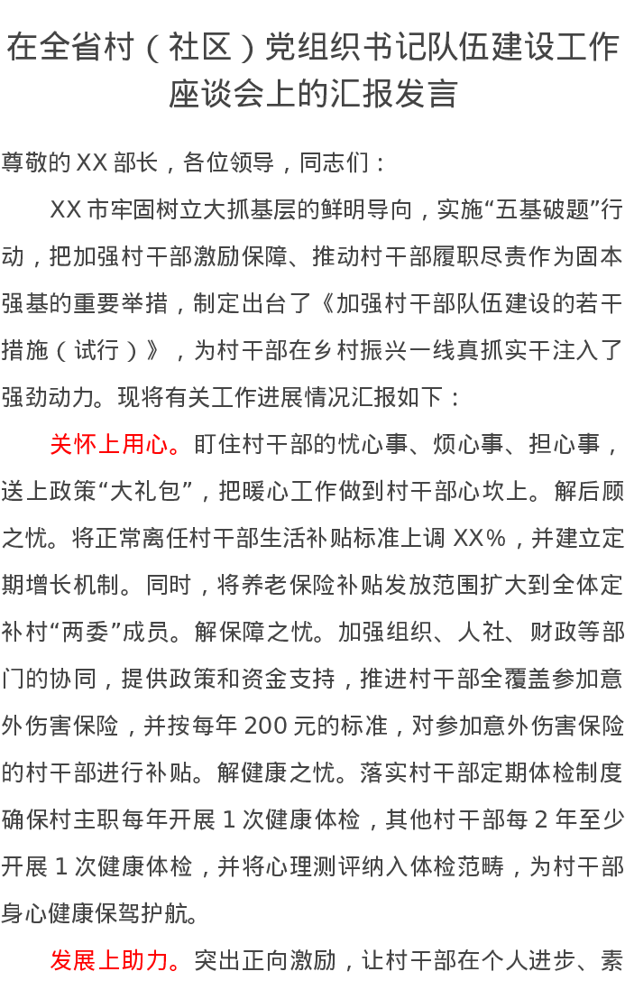在全省村(社区)党组织书记队伍建设工作座谈会上的汇报发言