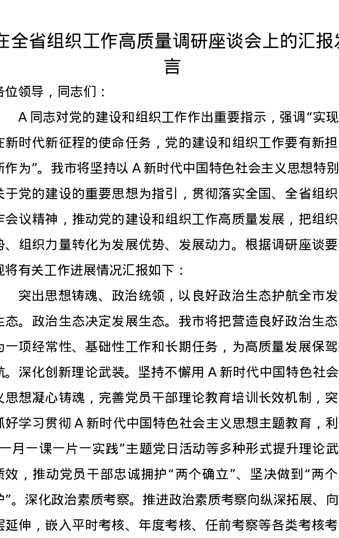 在全省组织工作高质量调研座谈会上的汇报发言