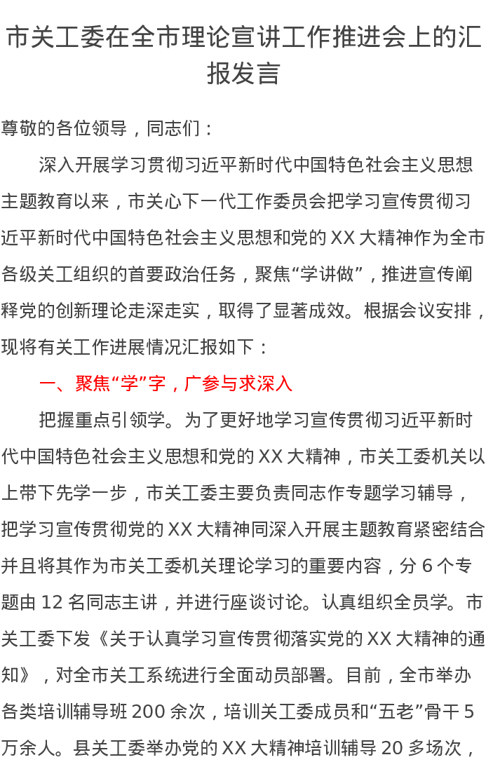 市关工委在全市理论宣讲工作推进会上的汇报发言