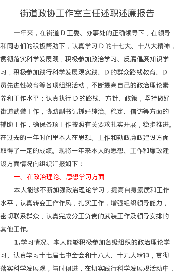 街道政协工作室主任述职述廉报告