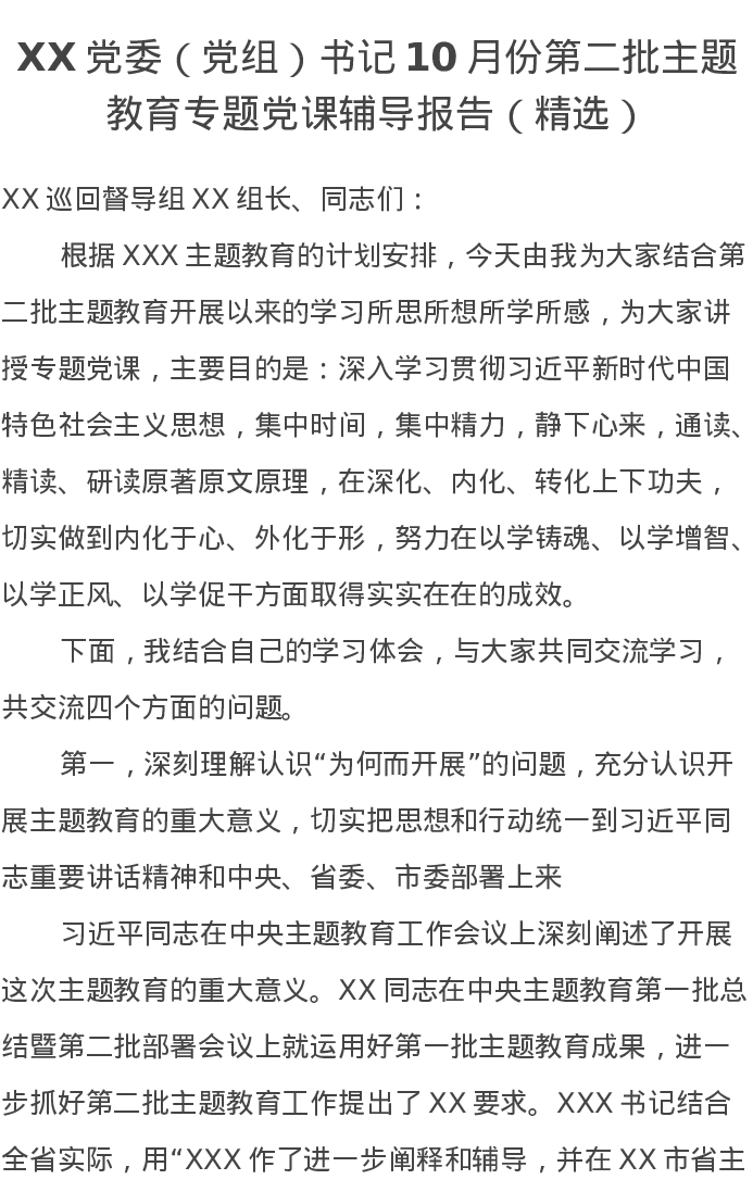 XX党委(党组)书记10月份第二批主题教育专题党课辅导报告(精选)特色社会主义思想