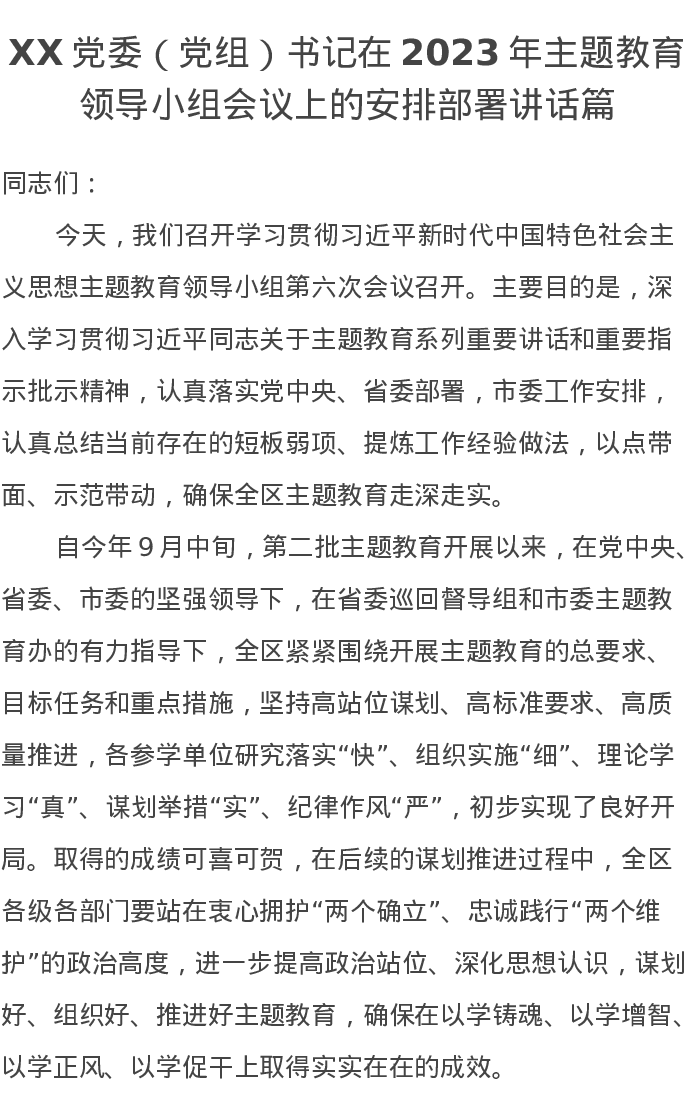 XX党委(党组)书记在2023年主题教育领导小组会议上的安排部署讲话篇(特色社会主义思想)