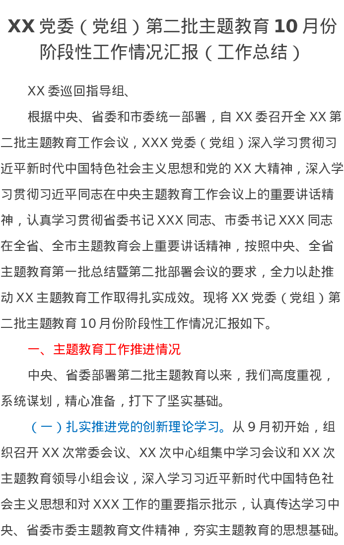 XX党委(党组)第二批主题教育10月份阶段性工作情况汇报(工作总结)特色社会主义思想