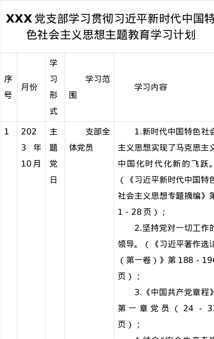 XX党支部学习贯彻2023年主题教育学习计划(特色社会主义思想)