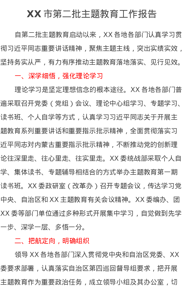 XX市第二批主题教育工作报告(特色社会主义思想)