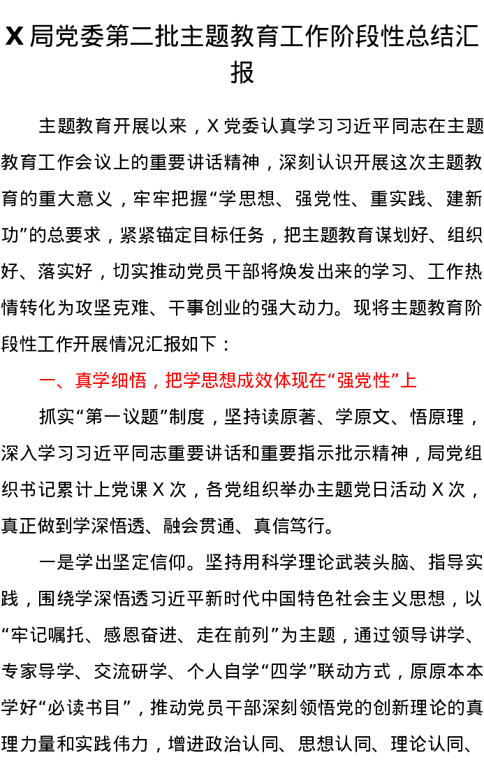 X局党委第二批主题教育工作阶段性总结汇报(特色社会主义思想)