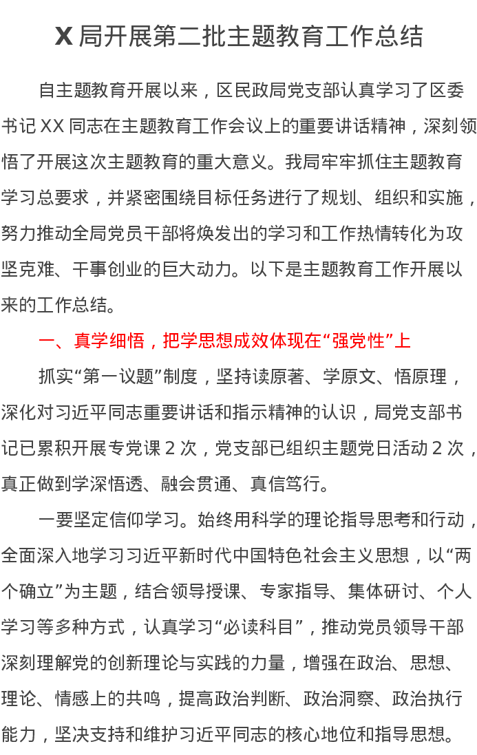 X局开展第二批主题教育工作总结(特色社会主义思想)
