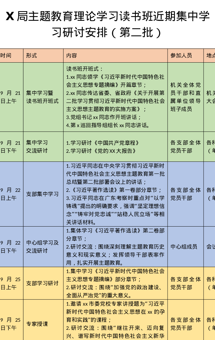 X局第二批主题教育理论学习读书班近期集中学习研讨安排计划(特色社会主义思想)
