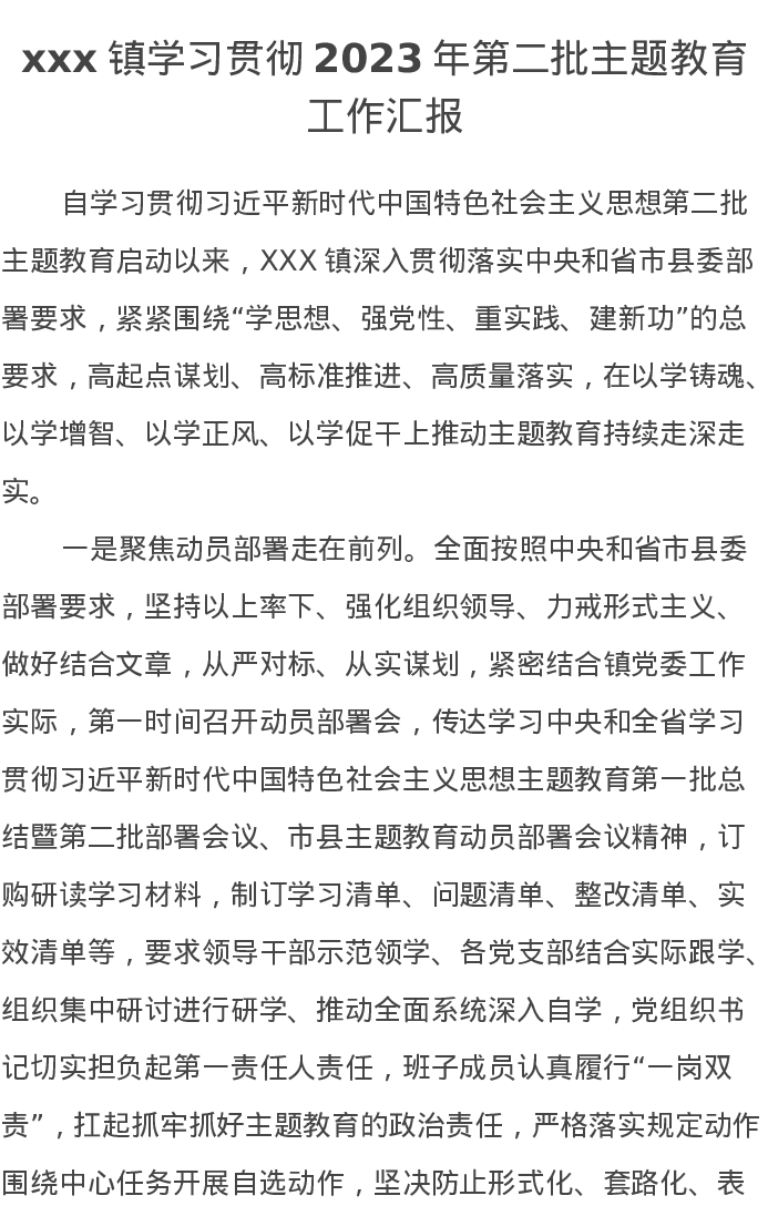 xxx镇学习贯彻2023年第二批主题教育工作汇报(特色社会主义思想)