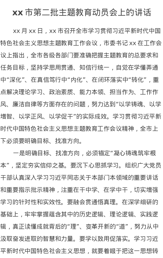 xx市第二批主题教育动员会上的讲话(特色社会主义思想)