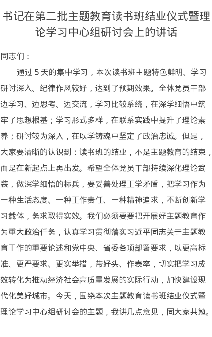 书记在第二批主题教育读书班结业仪式暨理论学习中心组研讨会上的讲话(特色社会主义思想)