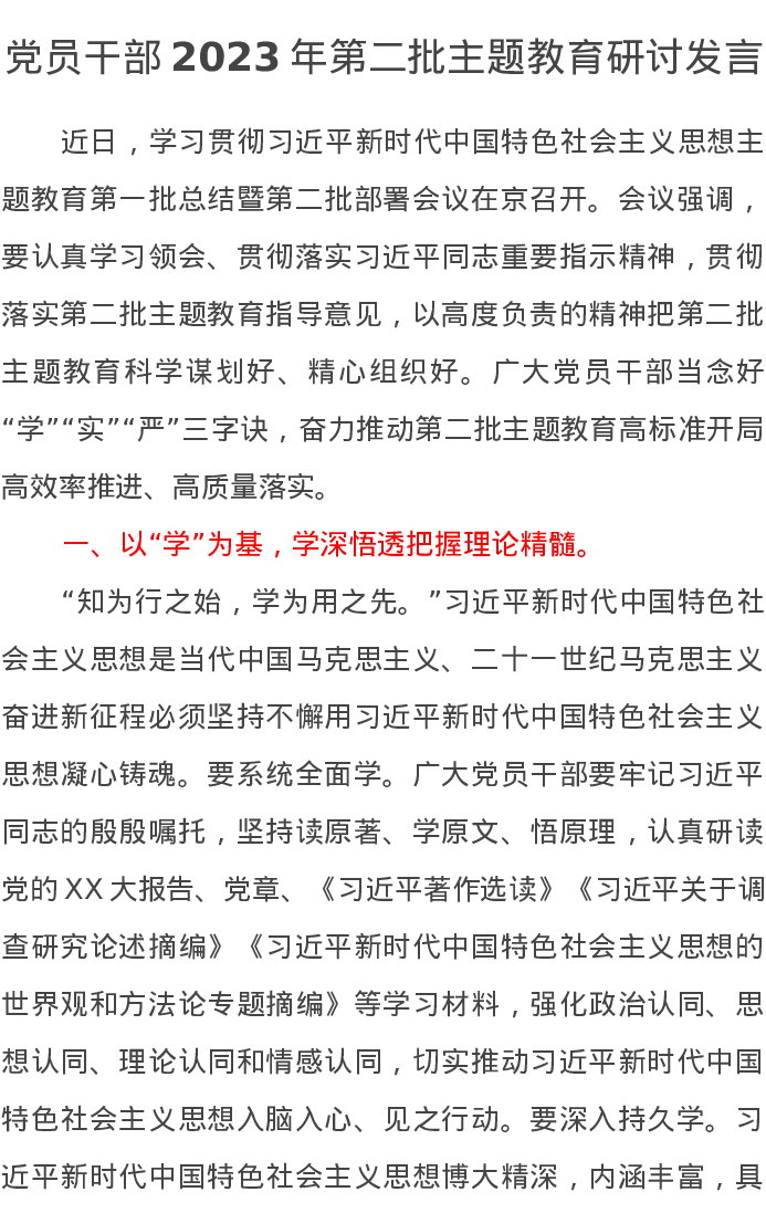 党员干部2023年第二批主题教育研讨发言(特色社会主义思想)