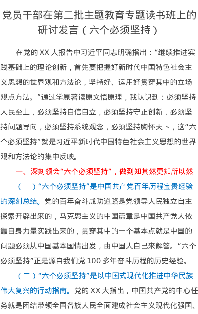 党员干部在第二批主题教育专题读书班上的研讨发言(六个必须坚持)特色社会主义思想