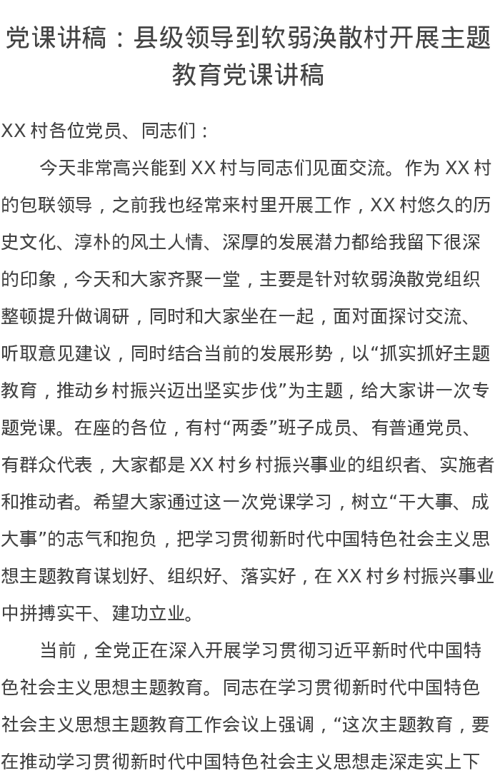 党课讲稿:县级领导到软弱涣散村开展第二批主题教育(特色社会主义思想)