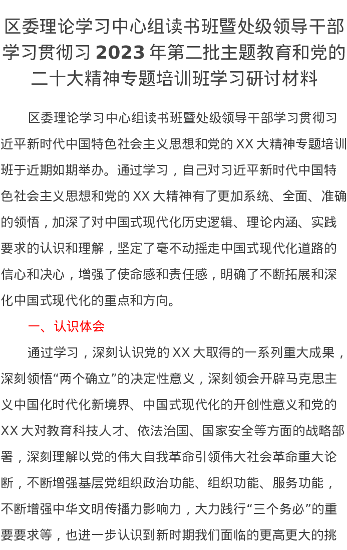 区委理论学习中心组读书班暨处级领导干部学习贯彻习2023年第二批主题教育和党的二十大精神专题培训班学习研讨发言(特色社会主义思想)
