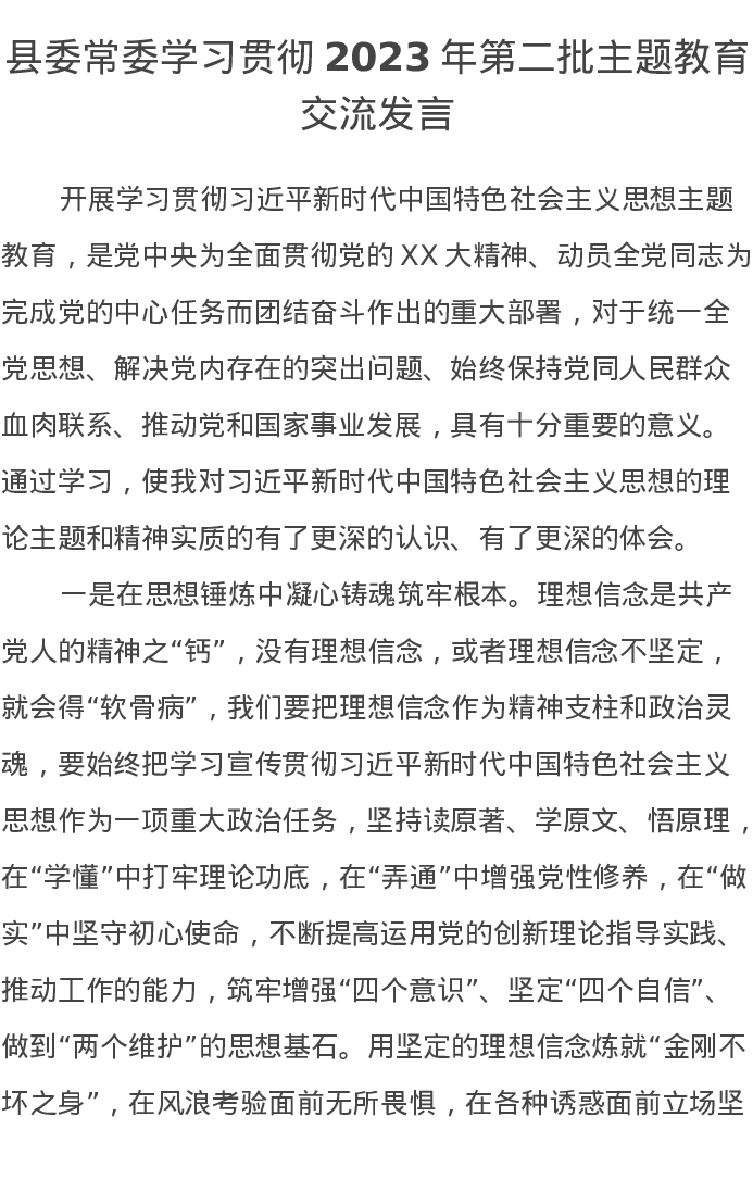 县委常委学习贯彻2023年第二批主题教育交流发言(特色社会主义思想)