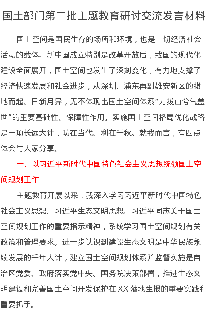 国土部门第二批主题教育研讨交流发言材料1(特色社会主义思想)