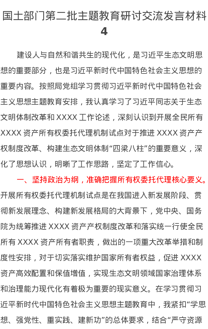 国土部门第二批主题教育研讨交流发言材料4(特色社会主义思想)