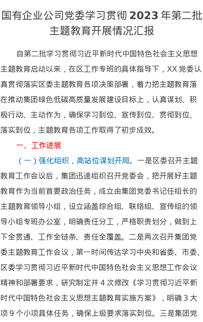 国有企业公司党委学习贯彻2023年第二批主题教育开展情况汇报(特色社会主义思想)