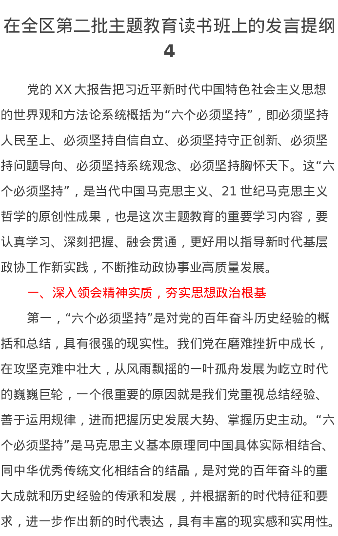 在全区第二批主题教育读书班上的发言提纲4(特色社会主义思想)