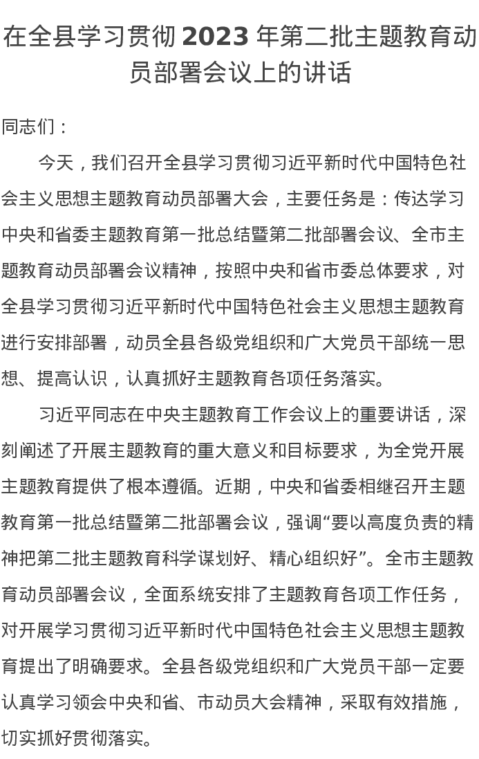 在全县学习贯彻2023年第二批主题教育动员部署会议上的讲话(特色社会主义思想)