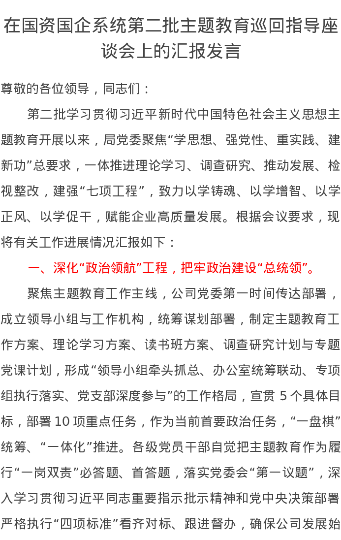 在国资国企系统第二批主题教育巡回指导座谈会上的汇报发言(特色社会主义思想)