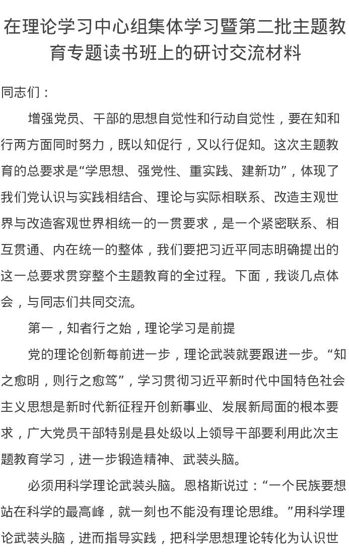 在理论学习中心组集体学习暨第二批主题教育专题读书班上的研讨交流材料(特色社会主义思想)