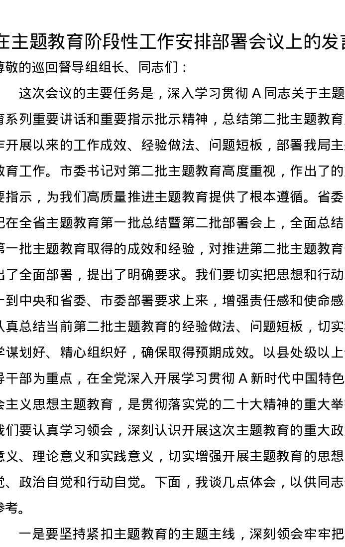 在第二批主题教育阶段性工作安排部署会议上的发言(特色社会主义思想)