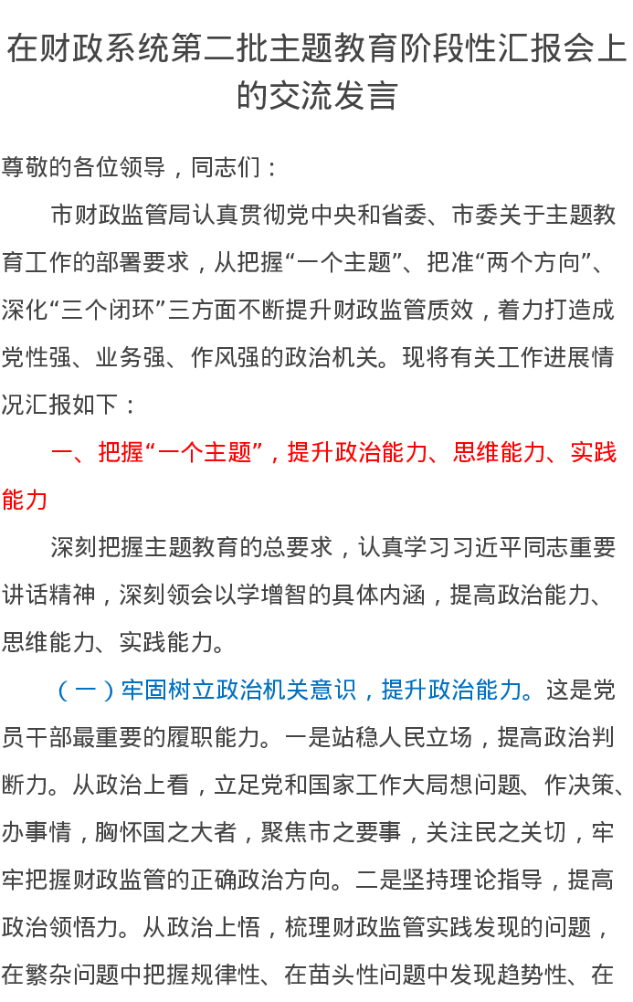 在财政系统第二批主题教育阶段性汇报会上的交流发言(特色社会主义思想)