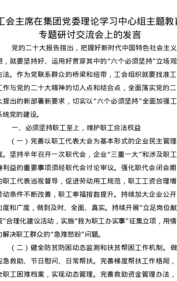 工会主席在集团党委理论学习中心组主题教育专题研讨交流会上的发言(特色社会主义思想)