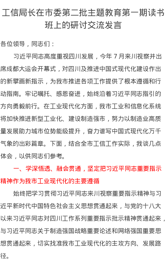 工信局长在市委第二批主题教育第一期读书班上的研讨交流发言(特色社会主义思想)