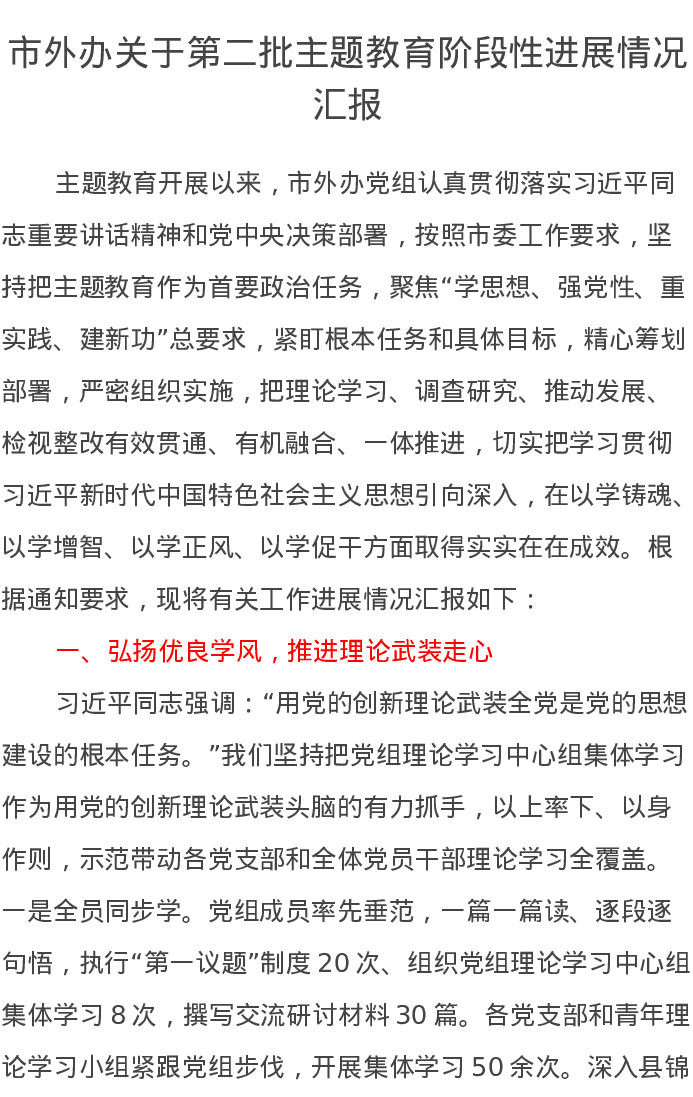 市外办关于第二批主题教育阶段性进展情况汇报(特色社会主义思想)