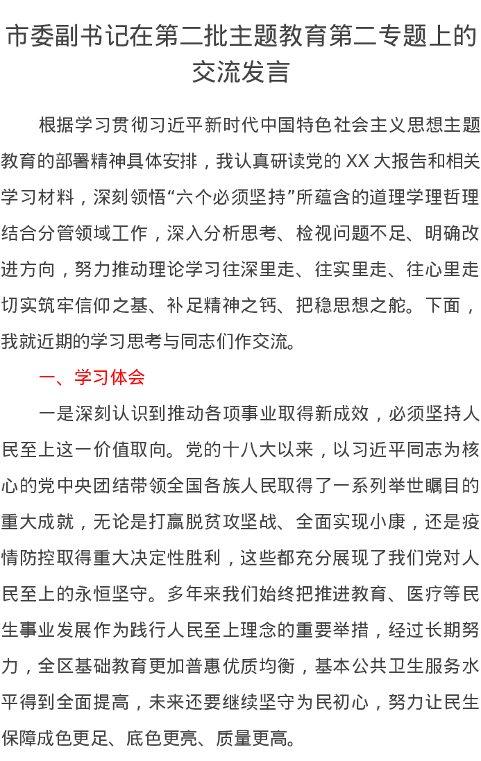 市委副书记在第二批主题教育第二专题上的交流发言(特色社会主义思想)