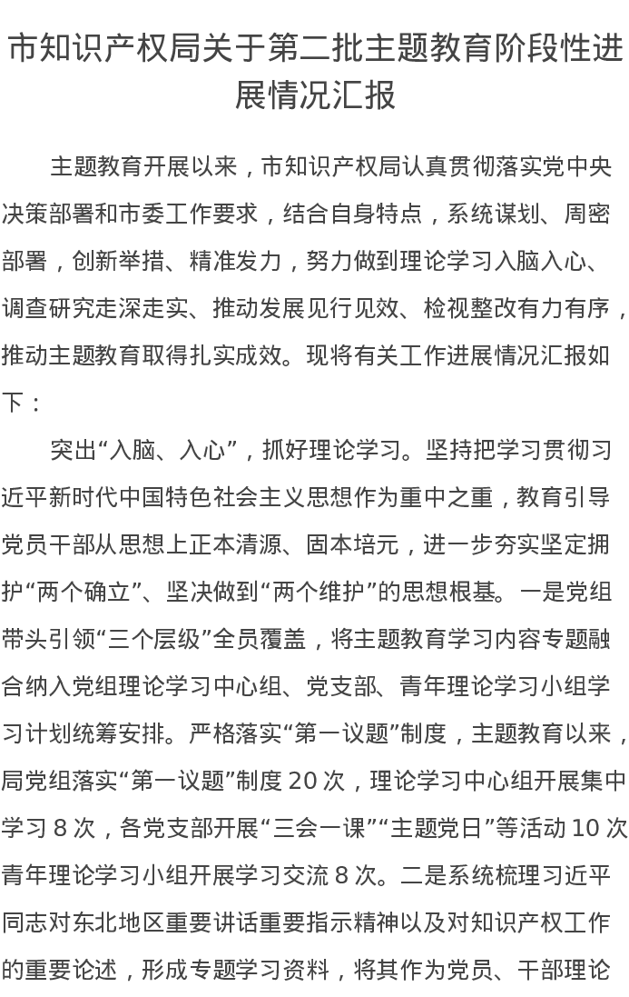 市知识产权局关于第二批主题教育阶段性进展情况汇报(特色社会主义思想)