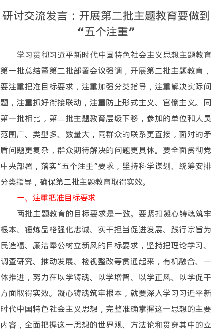 研讨交流发言:开展第二批主题教育要做到“五个注重”(特色社会主义思想)