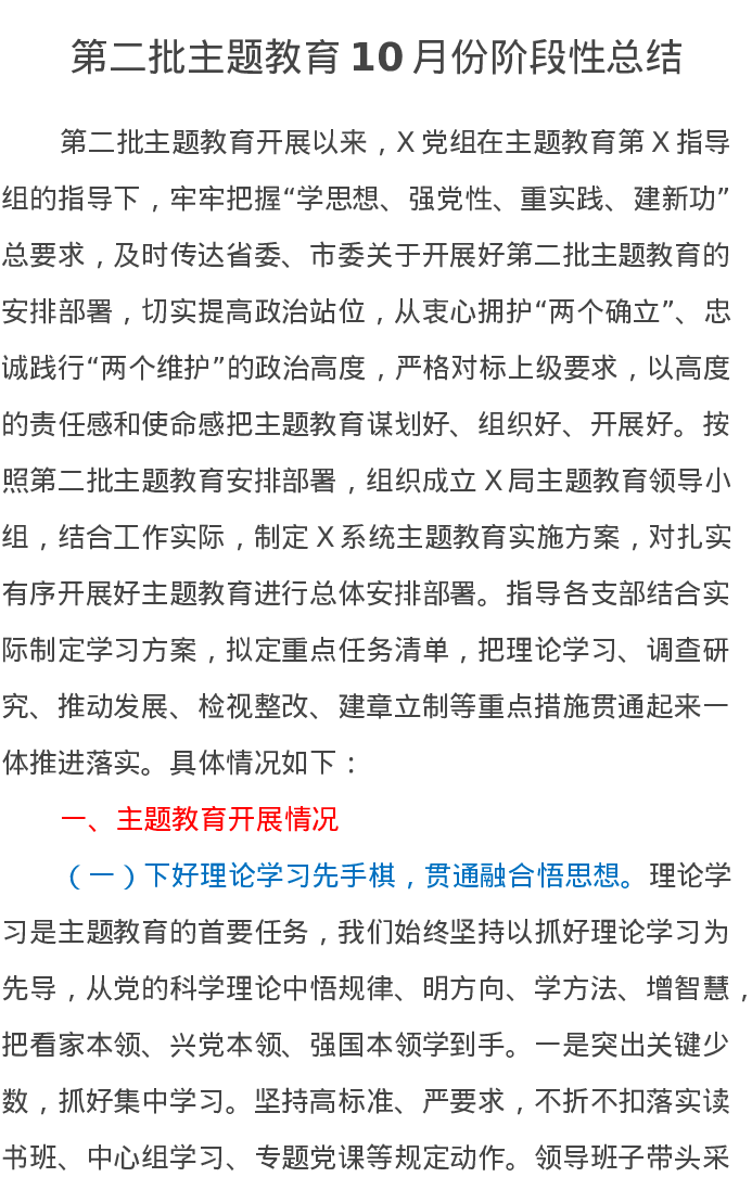 第二批主题教育10月份阶段性总结汇报(特色社会主义思想)