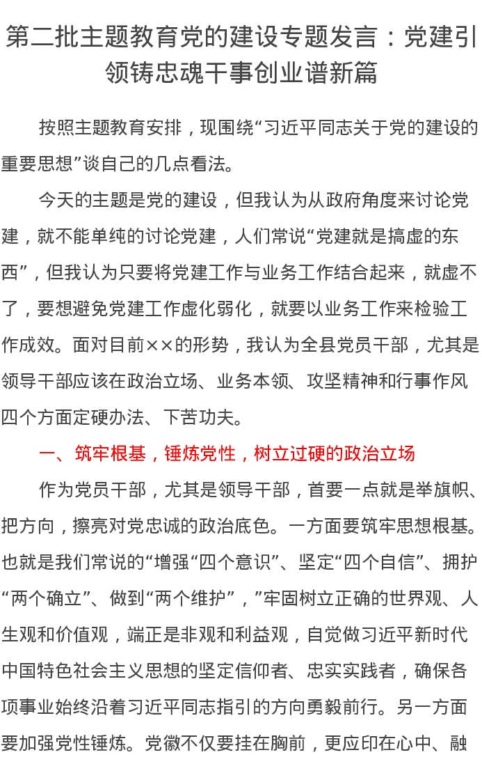 第二批主题教育党的建设专题发言:党建引领铸忠魂干事创业谱新篇(特色社会主义思想)