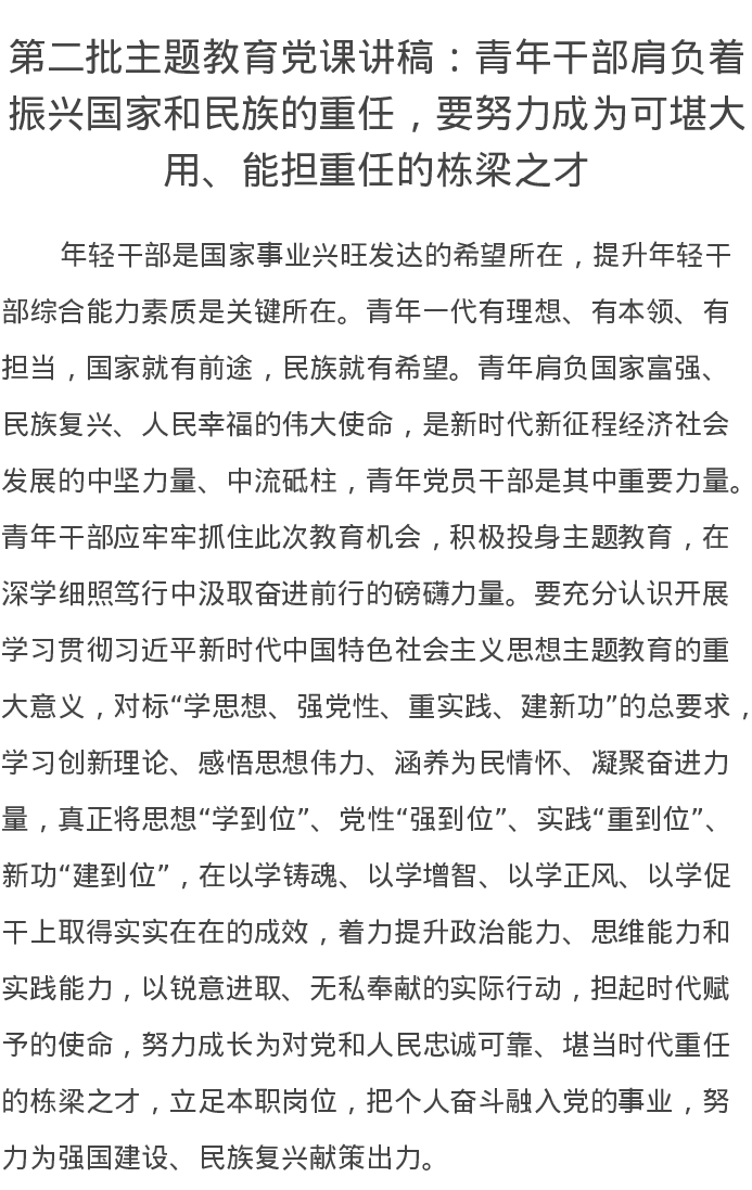 第二批主题教育党课讲稿:青年干部肩负着振兴国家和民族的重任,要努力成为可堪大用、能担重任的栋梁之才(特色社会主义思想)