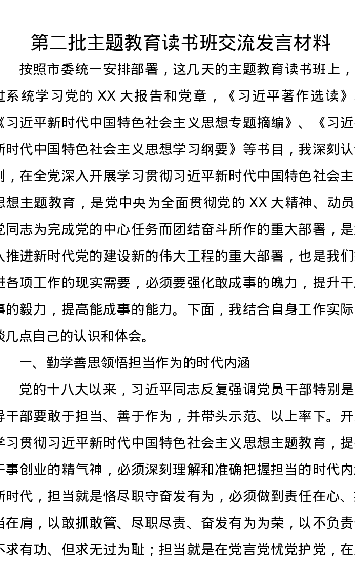第二批主题教育读书班交流发言材料(特色社会主义思想)