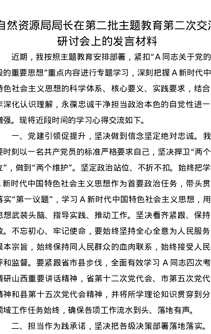 自然资源局局长在第二批主题教育第二次交流研讨会上的发言材料(特色社会主义思想)