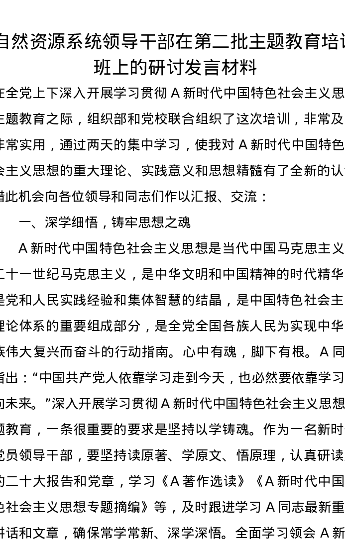自然资源系统领导干部在第二批主题教育培训班上的研讨发言材料(特色社会主义思想)