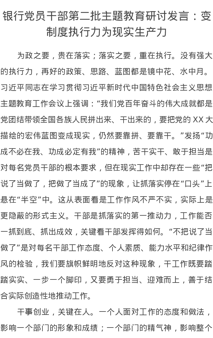 银行党员干部第二批主题教育研讨发言:变制度执行力为现实生产力(特色社会主义思想)