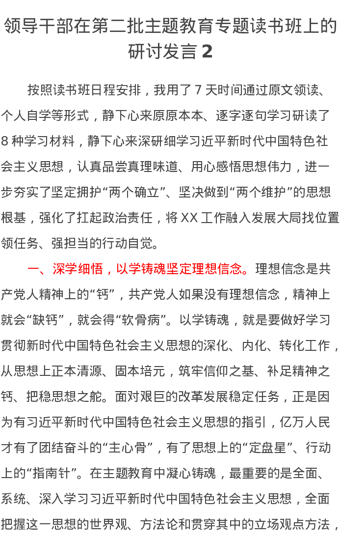 领导干部在第二批主题教育专题读书班上的研讨发言2(特色社会主义思想)