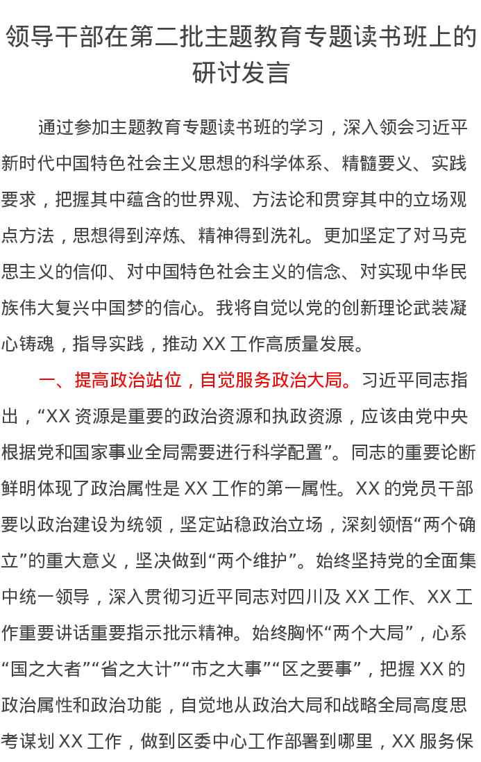 领导干部在第二批主题教育专题读书班上的研讨发言(特色社会主义思想)